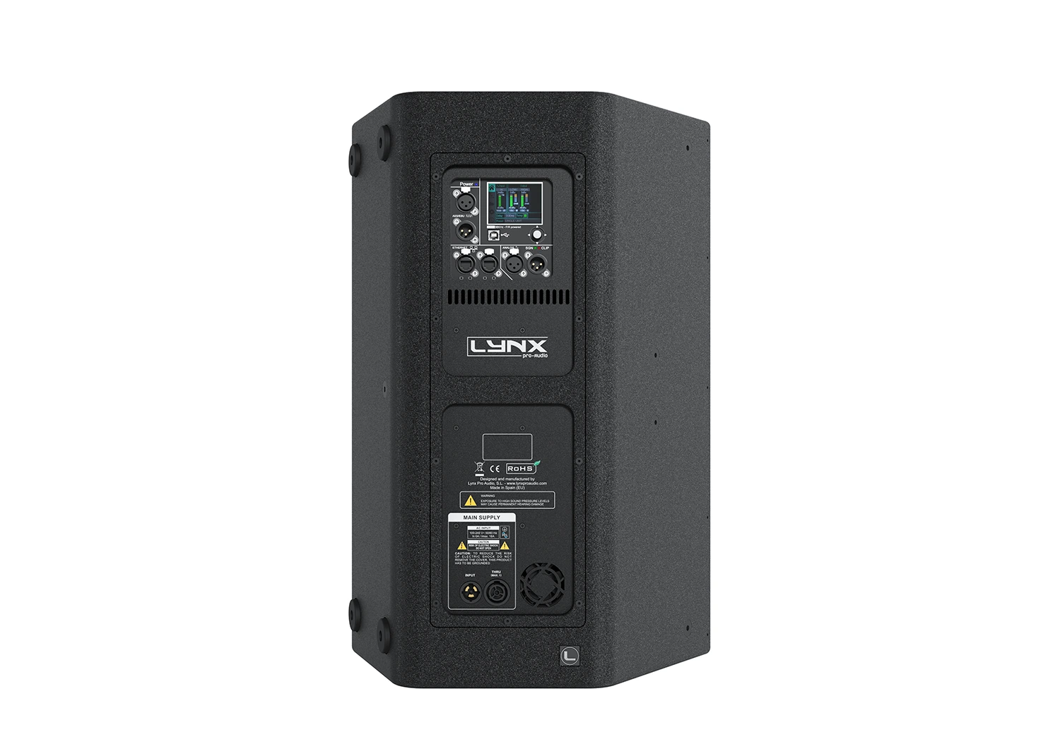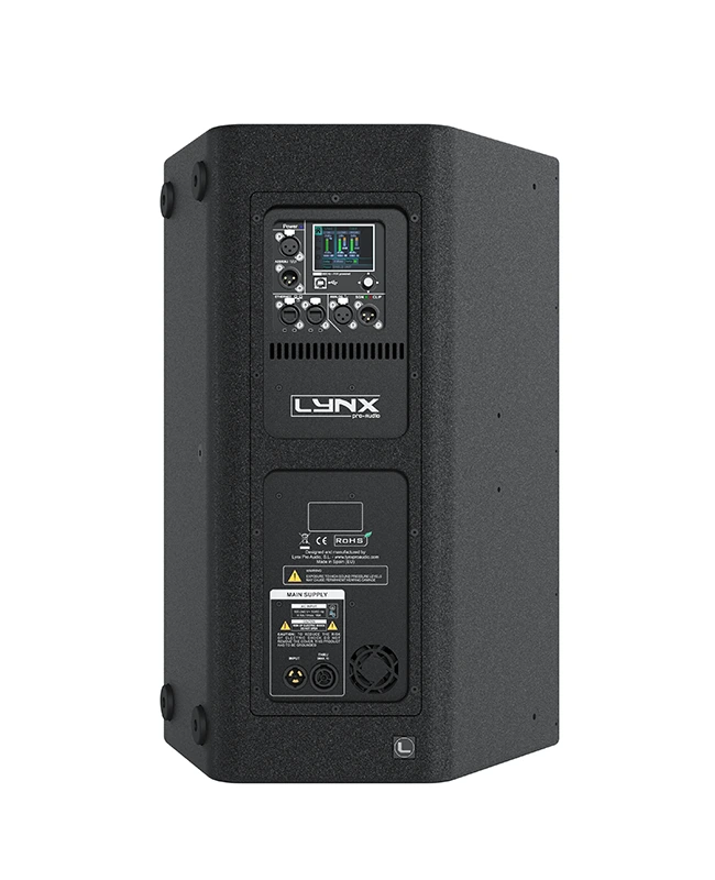 On the back panel of the cabinet you will find the digital control area. From the compact joystick located below the screen you are able to configure the Basic adjustment functions of the internal DSP.